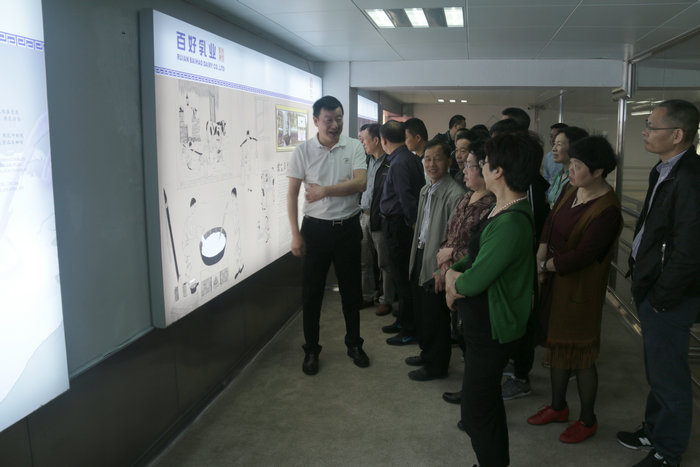 隨后王總帶領政協委員代表團一行人來到了大廳。大家賞析了記載著百好歷史與創新的《新百好記》。在產品展示架前,大家談論著百好煉奶,訴說著兒時記憶。